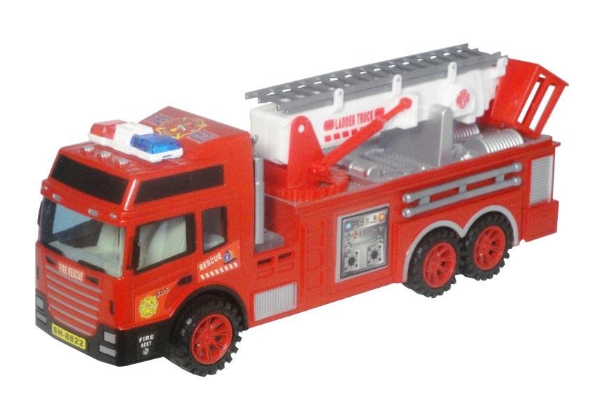 Plastikowy samochód bojowy straży pożarnej z rozsuwaną drabiną i ruchomym koszem. Zabawka wiernie odwzorowuje realny pojazd, dzięki czemu dziecko ma okazję poznać ciekawy zawód i rozwijać swoje umiejętnośc poznawcze.#&Zabawka dla dziecka powyżej 3 lat.#&Produkt zapakowany w kartonową podstawkę z przezroczystym kloszem.