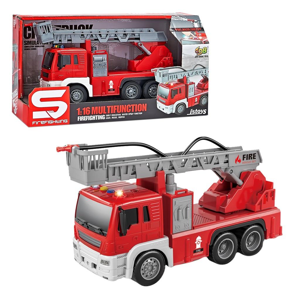 Straż pożarna z drabiną, pryskająca wodą. Drabina okręca się o 360 stopni. Efekty dźwiękowe i świetlne. Skala - 1:16 Wymagane baterie: 3xAG13 (dołączone)