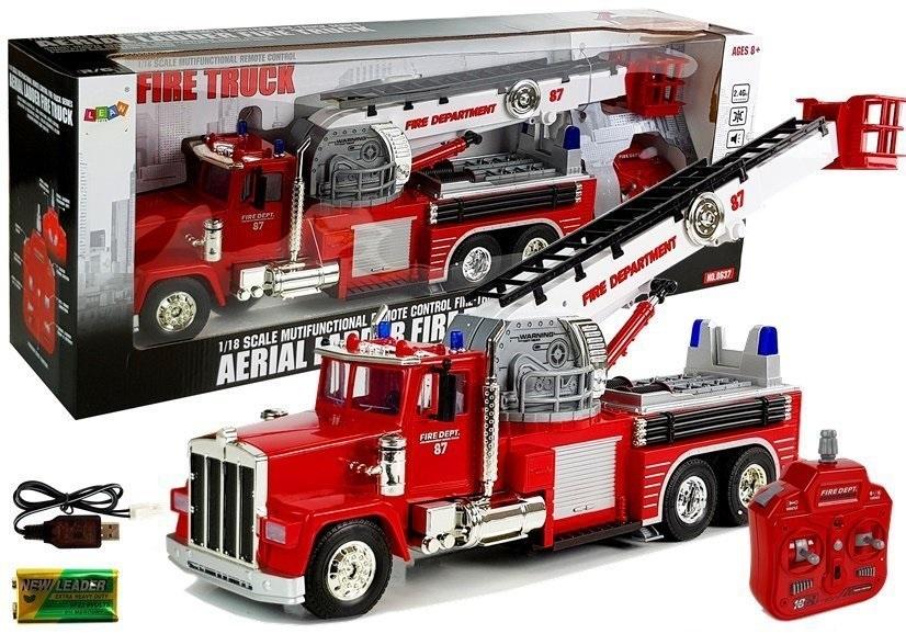 Wóz Strażacki Wysuwana Obrotowa Drabina R/C Dźwięk Syrena Światła Wóz strażacki jest potrzebny każdej ekipie dbającej o bezpieczeństwo ludzi. Zapewne znajdzie zastosowanie u małego przyszłego strażaka, który marzy, aby ratować ludzi i gasić pożary. Na pewno sprawi mu to wielką frajdę i dużo zabawy. Włączona zabawka miga niebieskimi światłami. Natomiast kontroler czerwoną diodą. I jest gotowa do zabawy! - Joistick dają możliwość poruszania się w przód ,tył oraz skręcać w prawo i lewo, towarzyszą temu sygnały dźwiękowe i świecące elementy, aby alarmować że nasz wóz jedzie na akcje. W tle także będziemy słyszeć dźwięk ognia. - Naciskając jednocześnie lewy i prawy kierunek oraz przód i tył a włączy się syrena przeciwpożarowa i wóz zacznie skręcać - Po włączeniu przycisku trąbki wóz strażacki włączy głośną syrenę, a naciskając na przycisk z wyciszeniem wszystkie głosy zostaną wyłączone - Super zaletą jest to, że drabina antenowa wysuwa się i wciąga swobodnie. Sterowane jest to osobnymi przyciskami na pilocie zamontowanymi z tyłu.Może również obracać się wokół własnej osi . Twój mały strażak może ugasić teraz pożar z każdej strony. - na środku znajduje się przycisk DEMO, jak lampka tylko zmieni się na zielono, wóz strażacki zostanie poinstruowany, aby wykonywać różne czynności. Akcje zostaną wykonane. Straż pożarna wykonana w skali 1: 18. Kontroler ma częstotliwość 2,4 GHz. Wymiary wozu strażackiego: 60 cm x 13 cm x 20,5 cm Pom rozłożeniu drabiny osiąga wysokość około 55 cm Wymiary pudełka: 74 cm x 28 cm x 17,5 cm Wóz zasilany 6 V baterią,natomiast pilot natomiast 1,9 V baterią, wszystkie są w zestawie. Dodatkowo kabel USB do ładowania. Zabawka przeznaczona jest dla dzieci powyżej 8 roku życia. Ambulans posiada certyfikat CE i jest zgodny z normą EN 71. Zapakowany jest w kartonik, dzięki czemu nadaje się idealnie na prezent.