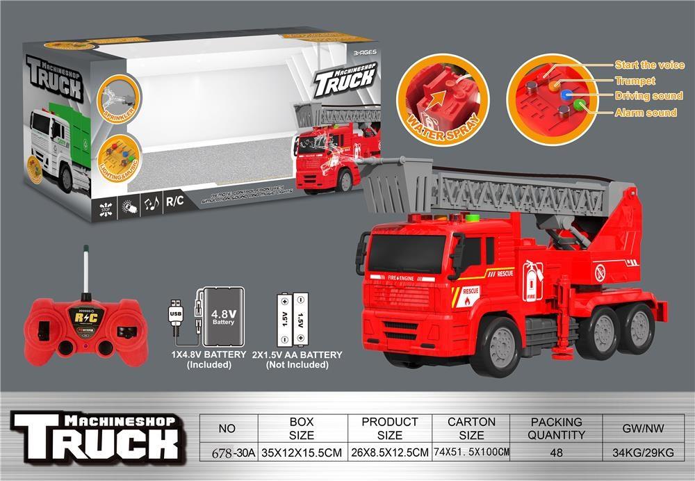 Straż pożarna zdalnie sterowana z pilotem RC. Samochód leje wodą, ma wysuwaną drabinę, a po na naciśnięciu przycisków wydaje dźwięki.
