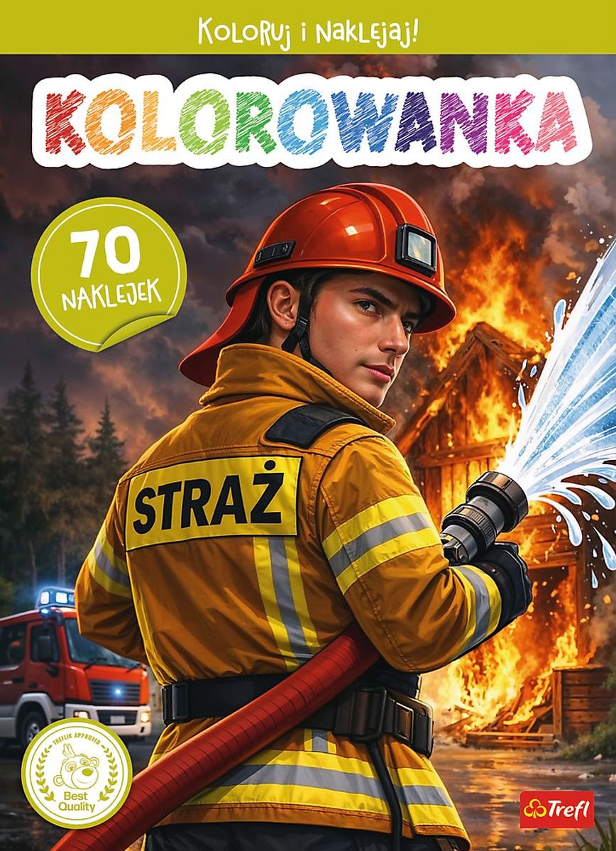 16-stronicowa kolorowanka ze scenkami z codziennej pracy ochotniczej straży pożarnej. W środku aż 70 naklejek.