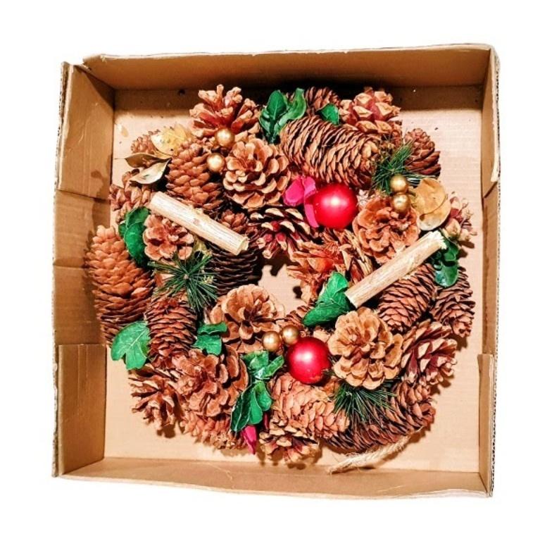 Okrągły, brązowe szyszki, czerwone bombki matowe, brązowe drewienka