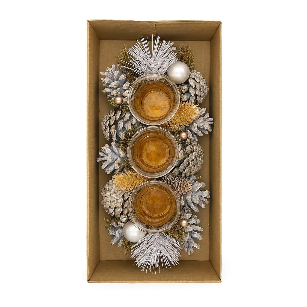 Elegancki stroik na Boże Narodzenie, o długości około 25-30cm. Nadaje się do położenia na świątecznym stole lub oknie. Naczynia w środku pozwalają na umieszczenie w nich trzech świec.