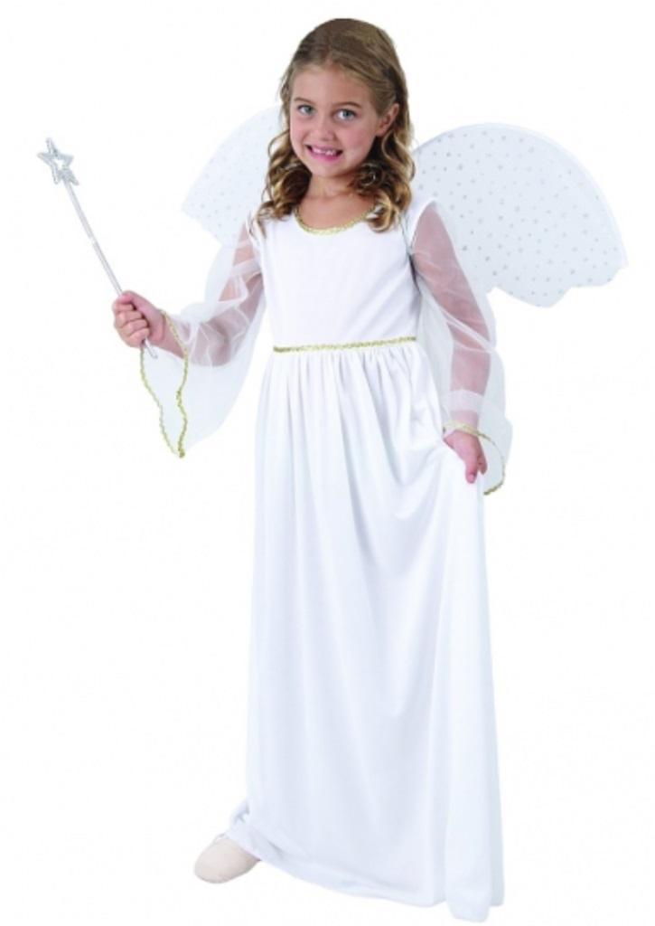 Strój dla dzieci. Rozmiar: 110/120 cm Wymiary: Długość całkowita: 92 cm Szerokość pod pachami: 29 cm Szerokość w pasie: 30 cm Materiał: 100% poliester. Do sukienki dołączone są skrzydełka.