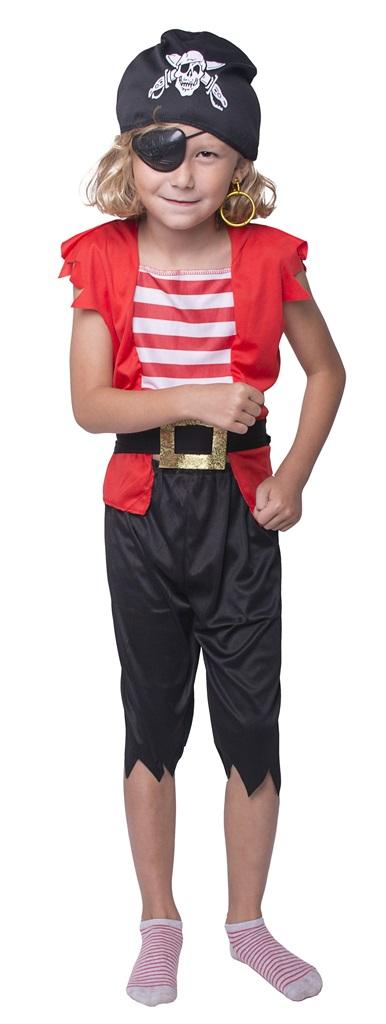 Przebranie dla chłopca - pirat. W skład zestawu wchodzi: - koszulka w biało-czerwone pasy z krótkim rękawem, - czarne spodenki, - pasek z czaszką, - czerwona opaska na głowę. Strój na bal przebierańców, zabawy karnawałowe w szkole i przedszkolu, zabawę tematyczną. Strój w rozmiarze M na wzrost 120 cm - 130 cm.