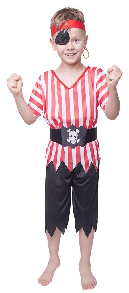 "Przebranie dla chłopca - pirat. W skład zestawu wchodzi: - koszulka w biało-czerwone pasy z krótkim rękawem, - czarne spodenki, - pasek z czaszką, - czerwona opaska na głowę. Strój na bal przebierańców, zabawy karnawałowe w szkole i przedszkolu, zabawę tematyczną. Strój w rozmiarze S na wzrost 110 cm - 120 cm."