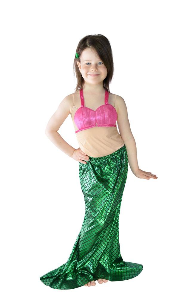 "Przebranie dla dziewczynki - Syrenka. W skład zestawu wchodzi spódnica w kształcie ogona syrenki oraz stanik. Strój na bal przebierańców, zabawy karnawałowe w szkole i przedszkolu. Strój w rozmiarze L na wzrost 130 cm - 140 cm."