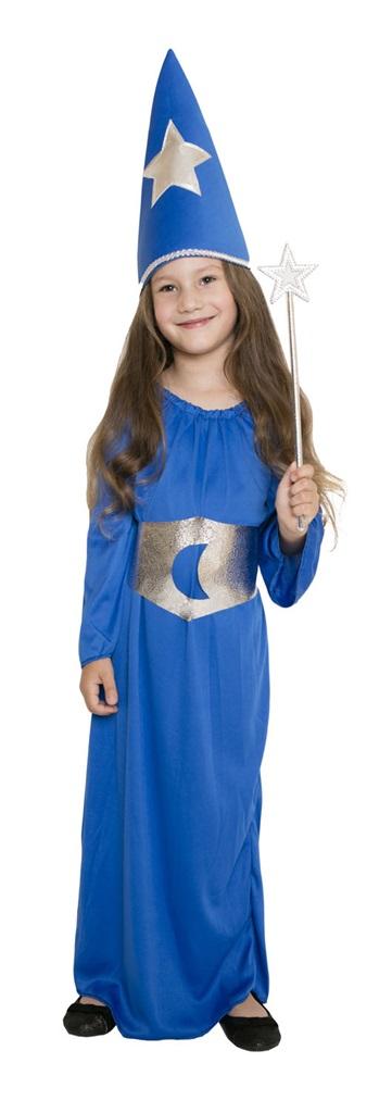 Komplet zawiera długą niebieską sukienkę ze srebrnym paskiem oraz czapkę. Rozmiar: S (110-120 cm)