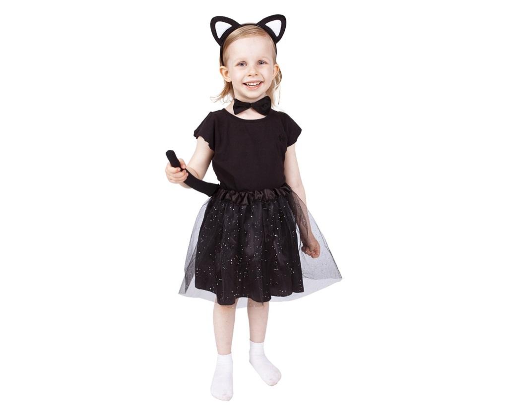 Strój KOTKA dla dziewczynki Strój zawiera: spódniczka, opaska, muszka, ogonek na rzep Kolor dominujący: czarny Rozmiar: 90-120 cm Materiał: tiul, poliester Producent: Godan S.A. Tiulowa SPÓDNICZKA TUTU Przyprószona brokatowym, mieniącym się w świetle konfetti (gwiazdki i kwadraciki). Spódniczka składa się z dwóch warstw wygodnych i miłych w dotyku materiałów. Uniwersalny rozmiar i rozciągliwa gumka sprawiają, że spódniczka pasuje na dzieci w różnym wieku. Długość: 30 cm Obwód w pasie min: 44 cm Obwód w pasie max: 64 cm Wzrost dziecka: 90-120 cm OPASKA KOCIE USZKA Komfortowy, nieuciskający pałąk łatwo dopasowujący się do kształtu i rozmiaru głowy. Mięciutkie i ślicznie wykończone, pluszowe w dotyku uszka, nadają całej charakteryzacji prawdziwie kociej urody. Rozmiar: uniwersalny Długość pałąka: 35 cm KOCI OGONEK Gibki, przyczepny, łatwo i solidnie mocowany na rzep, nadaje kostiumowi kociego pazura! Długość: 28 cm Mocowanie: na rzep.