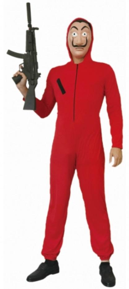 Strój dla dorosłych. Strój zawiera: kombinezon i maskę. Rozmiar: M Wymiary kombinezonu: Długość całkowita kombinezonu: ok. 147 cm (bez kaptura) Szerokość w ramionach: 47 cm Szerokość pod pachami: ok. 54 cm Długość rękawa: 64 cm Szerokość w pasie: ok. 39 cm bez rozciągania (Po rozciągnięciu ok. 63 cm). Długość nogawki: 83 cm Materiał: 100% poliester. Wymiary maski: Długość: 25,5 cm Szerokość: 16,5 cm Maska mocowana za pomocą gumki