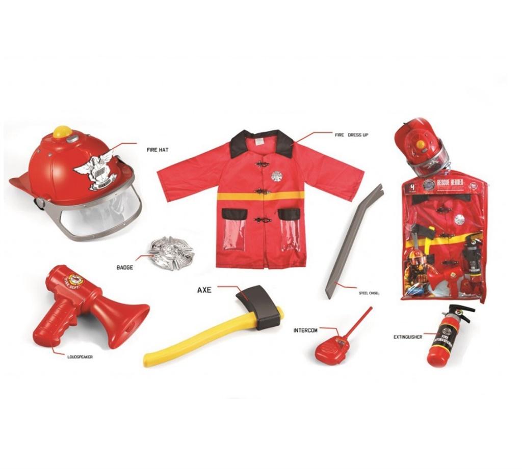 Strój Strażaka z ubraniem i akcesoriami. W zestawie: Kask, Kamizelka, Megafon, Siekiera, Odznaka, Krótkofalówka, Gaśnica, Łom. Zestaw idealny na karnawał, imprezy przebierane oraz do codziennej zabawy w domu!