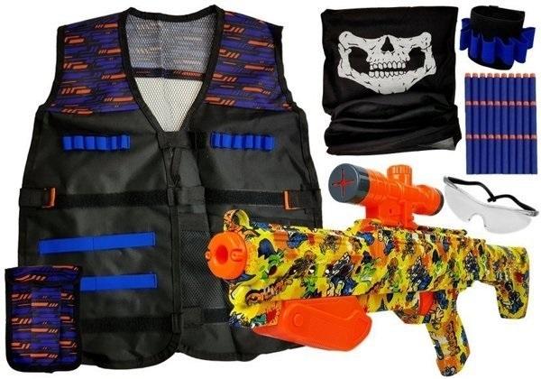 Prezentowany strój komandosa podbije serce nawet najmniejszego bohatera. Pozwoli wcielić się w członka rodziny wykonującego ten zawód, a także przygotować się do swojej pracy marzeń. Przebranie sprawdzi się nie tylko podczas wesołych zabaw w domu, ale i na przebieranych urodzinach czy balu karnawałowym. Chłopiec w stroju komandosa zaprowadzi porządek podczas wszystkich zabaw. Ten kompletny niezbędnik dla każdego prawdziwego bohatera z akcesoriami jest świetnie wykonany, co widać nie tylko w jakości, ale i odwzorowaniu realnych przedmiotów. Produkt wiekowo odpowiedni jest dla dzieci powyżej 3. roku życia. Kamizelka komandosa posiada kieszeń, wykonana jest w kolorze czarnym z elementami niebieskiego oraz pomarańczowego. Całość prezentuje się bardzo realistycznie. Tył kamizelki jest z siatki. W skład zestawu wchodzi duży karabin z celownikiem na piankowe naboje, które są w zestawie. Dodatkową zaletą jest chusta, która posiada wiele zastosowań m.in. może być maską, czapką pirata, szalikiem, apaszką, opaską czy czapką. Kamizelka posiada rzepy, dzięki którym jest możliwość regulacji szerokości.