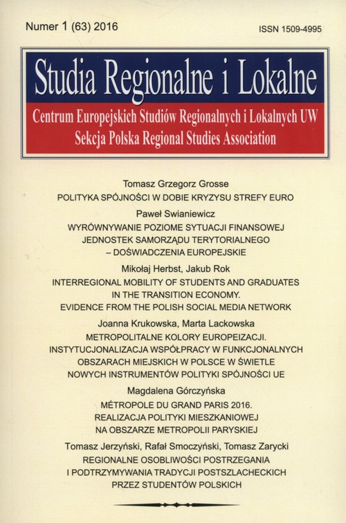 Tomasz Grzegorz Grosse: Polityka spójności w dobie kryzysu strefy euro [Cohesion policy during the crisis of the eurozone], doi: 10.7366/1509499516301, s. 5–25; Paweł Swianiewicz: Wyrównywanie poziome sytuacji finansowej jednostek samorządu terytorialnego – doświadczenia europejskie [Horizontal equalization of local government finance – European experience], doi: 10.7366/1509499516302, s. 26–55; Mikołaj Herbst, Jakub Rok: Interregional mobility of students and graduates in the transition economy. Evidence from the Polish social media network [Mobilność przestrzenna studentów i absolwentów uczelni wyższych w czasach transformacji. Analiza na podstawie danych z serwisu społecznościowego], doi: 10.7366/1509499516303, s. 56–81; Joanna Krukowska, Marta Lackowska: Metropolitalne kolory europeizacji. Instytucjonalizacja współpracy w funkcjonalnych obszarach miejskich w Polsce w świetle nowych instrumentów polityki spójności UE [Metropolitan colours of Europeanization. Institutionalization of cooperation in functional urban areas in Poland in the context of new EU cohesion policy instruments], doi: 10.7366/1509499516304, s. 82–107; Magdalena Górczyńska: Métropole du Grand Paris 2016. Realizacja polityki mieszkaniowej na obszarze metropolii paryskiej [Métropole du Grand Paris 2016: Housing policy in the Paris metropolitan area], doi: 10.7366/1509499516305, s. 108–128; Tomasz Jerzyński, Rafał Smoczyński, Tomasz Zarycki: Regionalne osobliwości postrzegania i podtrzymywania tradycji postszlacheckich przez studentów polskich [Regional peculiarities in the functioning and perception of old noble traditions among Polish students], doi: 10.7366/1509499516306, s. 129–154. SPRAWOZDANIA [Reports] Przemysław Śleszyński: System osadniczy i zasięgi oddziaływania miast a podział terytorialny kraju. Diagnoza, ocena, optymalizacja, doi: 10.7366/1509499516307, s. 155–159.