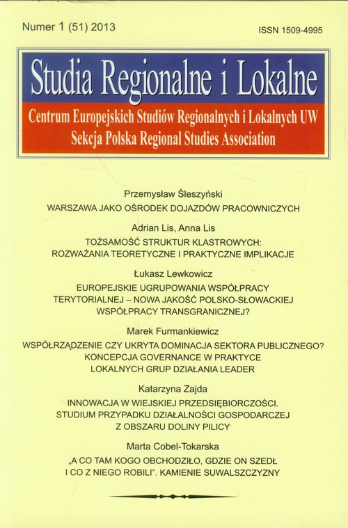 W numerze [Contents]: Przemysław Śleszyński: Warszawa jako ośrodek dojazdów pracowniczych [Warsaw as a commuting centre], s. 5–25; Adrian Lis, Anna Lis: Tożsamość struktur klastrowych – rozważania teoretyczne i praktyczne implikacje [Indentity of cluster structures. Theoretical considerations and practical implications], s. 16–44; Łukasz Lewkowicz: Europejskie ugrupowania współpracy terytorialnej – nowa jakość polsko-słowackiej współpracy transgranicznej? [European groupings of territorial cooperation – a new quality of the Polish-Slovak trans-frontier cooperation?], s. 45–70; Marek Furmankiewicz: Współrządzenie czy ukryta dominacja sektora publicznego? Koncepcja governance w praktyce lokalnych grup działania LEADER [Co-governance or hidden domination of the public sector? The concept of governance in the practice of ‘Leader’ Local Action Groups], s. 71–89; Katarzyna Zajda: Innowacja w wiejskiej przedsiębiorczości. Studium przypadku działalności gospodarczej z obszaru Doliny Pilicy [Innovation in rural entrepreneurship. Case study of economic activities in the Pilica River Valley (Dolina Pilicy)], s. 90–106; Marta Cobel-Tokarska: „A co tam kogo obchodziło, gdzie on szedł i co z niego robili”. Kamienie Suwalszczyzny [Rocks of the Suwałki region], s. 107–124; Recenzje [Book Reviews] Andrzej Miszczuk: Andrzej Raczyk, Sylwia Dołzbłasz, Małgorzata Leśniak-Johann, Relacje współpracy i konkurencji na pograniczu polsko-niemieckim, s. 125–126; Jerzy J. Parysek: Ryszard Domański, Ewolucyjna gospodarka przestrzenna, s. 127–130; Maciej J. Nowak: Alina Maciejewska (red.), Gospodarka przestrzenna w świetle wymagań strategii zrównoważonego rozwoju, s. 131–133.