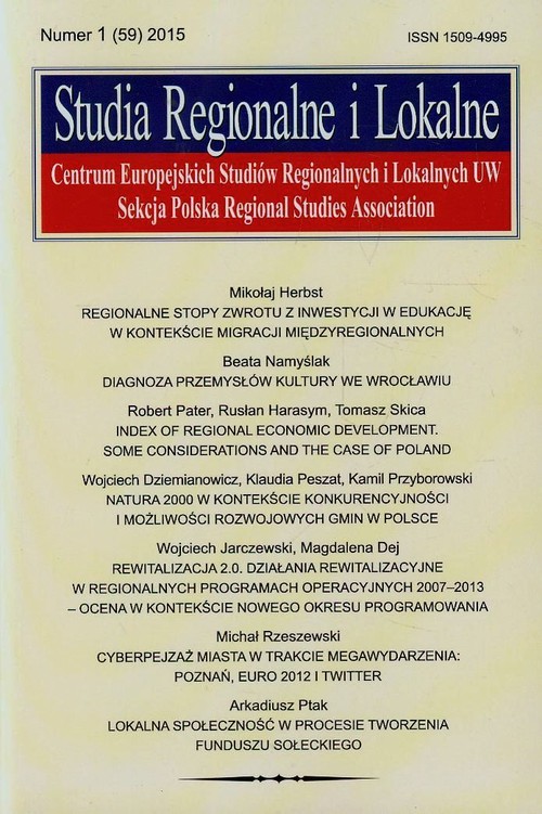 ARTYKUŁY Mikołaj Herbst: Regionalne stopy zwrotu z inwestycji w edukację w kontekście migracji międzyregionalnych Beata Namyślak: Diagnoza przemysłów kultury we Wrocławiu Robert Pater, Rusłan Harasym, Tomasz Skica: Index of regional economic development. Some considerations and the case of Poland Wojciech Dziemianowicz, Klaudia Peszat, Kamil Przyborowski: Natura 2000 w kontekście konkurencyjności i możliwości rozwojowych gmin w Polsce Wojciech Jarczewski, Magdalena Dej: Rewitalizacja 2.0. Działania rewitalizacyjne w Regionalnych Programach Operacyjnych 2007–2013 – ocena w kontekście nowego okresu programowania Michał Rzeszewski: Cyberpejzaż miasta w trakcie megawydarzenia: Poznań, Euro 2012 i Twitter Arkadiusz Ptak: Lokalna społeczność w procesie tworzenia funduszu sołeckiego