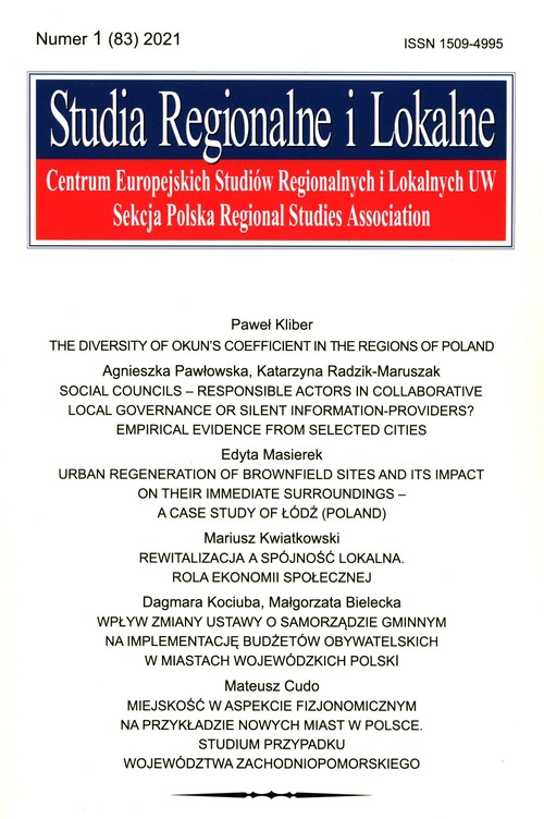 Artykuły: Paweł Klieber, The Diversity of Okun’s Coefficient in the Regions of Poland Agnieszka Pawłowska, Katarzyna Radzik-Maruszak, Social Councils - Responsible Actors in Collaborative Local Governance or Silent Information-Providers? Empirical Evidencefrom Selected Cities Społeczne rady – odpowiedzialni aktorzy lokalnego współrządzenia czy milczący informatorzy? Rezultaty badań empirycznych z wybranych polskich miast Edyta Masierek, Urban Regeneration of Brownfield Sites and its Impact on Their Immediate Surroundings – A Case Study of Łódź (Poland) Rewitalizacje obszarów poprzemysłowych i ich wpływ na najbliższe otoczenie – przypadek Łodzi Mariusz Kwiatkowski, Rewitalizacja a spójność lokalna Rola ekonomii społecznej Revitalisation and Local Cohesion. The Role of Social Economy Dagmara Bielecka, Małgorzata Kociuba, Wpływ zmiany ustawy o samorządzie gminnym na implementację budżetów obywatelskich w miastach wojewódzkich Polski Influence of the Amendment to the Law on Municipal Self-Government on the Implementation of Participatory Budgeting in Voivodship Cities in Poland Mateusz Cudzo, Miejskość w aspekcie fizjonomicznym na przykładzie nowych miast w Polsce. Studium przypadku województwa zachodniopomorskiego The Physiognomic Aspect of Urbanness on the Example of New Towns in Poland. A Case Study of the Zachodniopomorskie Voivodship