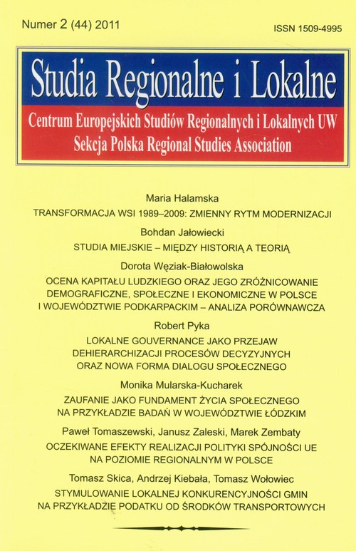 Transformacja wsi 1989-2009: zmienny rytm modernizacji Studia miejskie - między historią a teorią Ocena kapitału ludzkiego oraz jego zróżnicowanie demograficzne, społeczne i ekonomiczne w Polsce i województwie podkarpackim - analiza porównawcza Lokalne gouvernance jako przejaw dehierarchizacji procesów decyzyjnych oraz nowa forma dialogu społecznego Zaufanie jako fundament życia społecznego na przykładzie badań w województwie łódzkim Oczekiwane efekty realizacji polityki spójności UE na poziomie regionalnym w Polsce Stymulowanie lokalnej konkurencyjności gmin na przykładzie podatku od środków transportowych.