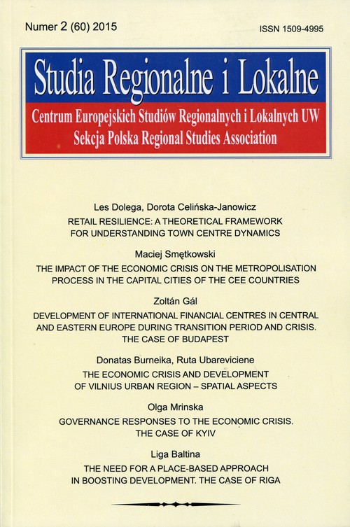 Contents [W numerze]: Olga Mrinska, Maciej Smętkowski: Foreword [Słowo wstępne], s. 5–8; Les Dolega, Dorota Celińska-Janowicz: Retail resilience: A theoretical framework for understanding town centre dynamics [Rezyliencja handlowa: ramy teoretyczne dla zrozumienia przekształceń centrum miasta], doi: 10.7366/1509499526001, s. 8–31; Maciej Smętkowski: The impact of the economic crisis on the metropolisation process in the capital cities of the CEE countries [Wpływ kryzysu gospodarczego na proces metropolizacji w miastach stołecznych krajów Europy Środkowo-Wschodniej], doi: 10.7366/1509499526002, s. 32–52; Zoltán Gál: Development of international financial centres in Central and Eastern Europe during transition period and crisis. The case of Budapest [Rozwój międzynarodowych centrów finansowych w Europie Środkowej i Wschodniej w okresie transformacji i kryzysu. Przykład Budapesztu], doi: 10.7366/1509499526003, s. 53–80; Donatas Burneika, Ruta Ubareviciene: The economic crisis and development of Vilnius urban region – spatial aspects [Kryzys gospodarczy a rozwój regionu miejskiego Wilna – aspekty przestrzenne], doi: 10.7366/1509499526004, s. 81–96; Olga Mrinska: Governance responses to the economic crisis. The case of Kyiv [Zarządzanie w okresie kryzysu gospodarczego. Przykład Kijowa], doi: 10.7366/1509499526005, s. 97–113; Liga Baltina: The need for a place-based approach in boosting development:The case of Riga [Wykorzystanie koncepcji polityki ukierunkowanej terytorialnie w celu pobudzenia rozwoju. Przykład Rygi], doi: 10.7366/1509499526006, s. 114–129; REPORT – RSA Research Network ‘The impact of global economic crisis on capital cities’, s. 130–137. Zeszyt wydany w języku angielskim