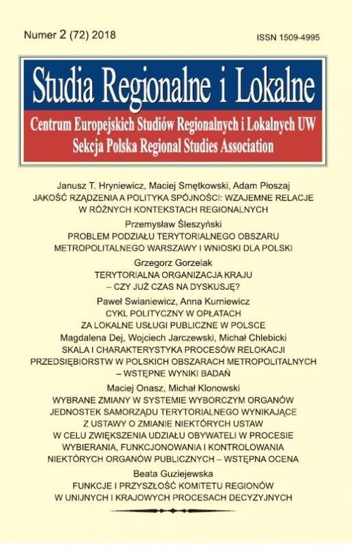 W numerze [Contents] ARTYKUŁY [Articles] Janusz T. Hryniewicz, Maciej Smętkowski, Adam Płoszaj: Jakość rządzenia a polityka spójności: wzajemne relacje w różnych kontekstach regionalnych [The quality of government and the EU Cohesion Policy: Mutual relations in different regional contexts], doi 10.7366/1509499527201, s. 5-28; Przemysław Śleszyński: Problem podziału terytorialnego Obszaru Metropolitalnego Warszawy i wnioski dla Polski [The problem of territorial division of the Warsaw Metropolitan Area and its implications for Poland], doi 10.7366/1509499527202, s. 29-47; Grzegorz Gorzelak: Terytorialna organizacja kraju - czy już czas na dyskusję?, doi 10.7366/1509499527203; s. 48-55; Paweł Swianiewicz, Anna Kurniewicz: Cykl polityczny w opłatach za lokalne usługi publiczne w Polsce [The political cycle in tariffs on local public services in Poland], doi 10.7366/1509499527204, s. 56-77; Magdalena Dej, Wojciech Jarczewski, Michał Chlebicki: Skala i charakterystyka procesów relokacji przedsiębiorstw w polskich obszarach metropolitalnych - wstępne wyniki badań [Scale and characteristics of company relocation processes in major metropolitan areas in Poland - Preliminary results], doi 10.7366/1509499527205, s. 78-98; Maciej Onasz, Michał Klonowski: Wybrane zmiany w systemie wyborczym organów jednostek samorządu terytorialnego wynikające z ustawy o zmianie niektórych ustaw w celu zwiększenia udziału obywateli w procesie wybierania, funkcjonowania i kontrolowania niektórych organów publicznych - wstępna ocena [Selected changes of the local government electoral system introduced by the act amending certain acts in order to increase the participation of citizens in the process of selecting, functioning and controlling some public bodies - A preliminary analysis], doi 10.7366/1509499527206, s. 99-117; Beata Guziejewska: Funkcje i przyszłość Komitetu Regionów w unijnych i krajowych procesach decyzyjnych [Functions and future of the European Committee of the Regions within EU and national decision-making processes], doi 10.7366/1509499527207, s. 118-132.