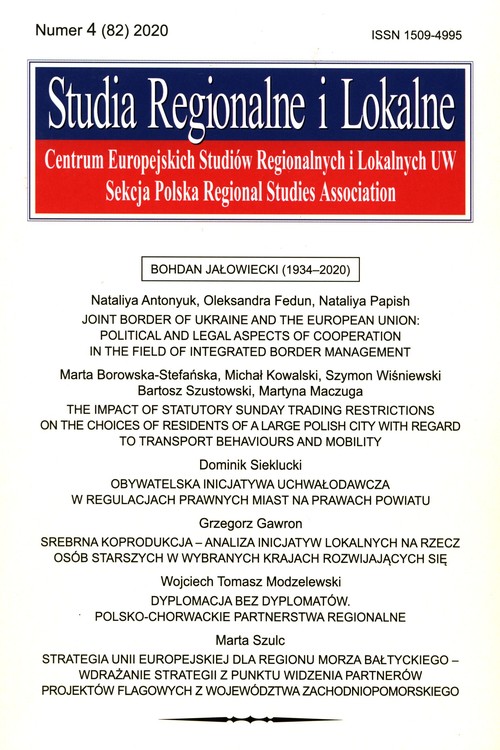 Nataliya Antonyuk, Oleksandra Fedun, Nataliya Papish: Joint Border of Ukraine and the European Union…: Political and Legal Aspects of Cooperation in the Field of Integrated Border Management [Wspólna granica między Ukrainą a Unią Europejską: polityczne i prawne aspekty współpracy w zakresie zintegrowanego zarządzania granicami] Marta Borowska-Stefańska, Michał Kowalski, Szymon Wiśniewski, Bartosz Szustowski, Martyna Maczuga: The Impact of Statutory Sunday Trading Restrictions on the Choices of Residents of a Large Polish City with Regard to Transport Behaviours and Mobility [Wpływ ustawowego ograniczenia handlu w niedziele na zachowania transportowe mieszkańców dużego miasta w Polsce] Dominik Sieklucki: Obywatelska inicjatywa uchwałodawcza… w regulacjach prawnych miast na prawach powiatu [Civic Resolution Initiative in Legal Regulations of Cities with County Rights] Grzegorz Gawron: Srebrna koprodukcja – analiza inicjatyw lokalnych na rzecz osób starszych w wybranych krajach rozwijających się [Silver Co-production – Analysis of Local Initiatives for the Elderly in Selected Developing Countries] Wojciech Tomasz Modzelewski: Dyplomacja bez dyplomatów…. Polsko-chorwackie partnerstwa regionalne [Diplomacy Without Diplomats. Polish-Croatian Regional Partnerships] Marta Szulc : Strategia Unii Europejskiej dla regionu Morza Bałtyckiego… – wdrażanie strategii z punktu widzenia partnerów projektów flagowych z województwa zachodniopomorskiego [Implementation of the European Union Strategy for the Baltic Sea Region from the perspective of the Flagship Project Partners from the Western Pomerania Region (Zachodniopomorskie Voivodship)]