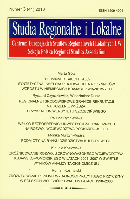 Syntetyczna i wieloaspektowa ocena czynników wzrostu w niemieckich krajach związkowych Regionalne i środowiskowe granice rekrutacji na uczelnię wyższą. Przykład Uniwersytetu Szczecińskiego Wpływ bezpośrednich inwestycji zagranicznych na rozwój województwa podkarpackiego Podmioty na rynku dziedzictwa kulturowego Zróżnicowanie rozwoju zrównoważonego województwa kujawsko-pomorskiego w latach 2004-2007 w świetle wyników analizy taksonomicznej Zróżnicowanie poziomu wydajności pracy i jego przyczyny w polskich województwach w latach 1998-2008