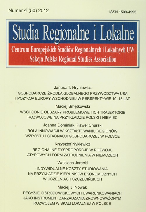 W numerze: Janusz T. Hryniewicz: Gospodarcze źródła globalnego przywództwa USA i pozycja Europy Wschodniej w perspektywie 10–15 lat [Economic sources of the United States’ role as a global leader and the position of Eastern Europe over the next 10-15 years], s. 5–28; Maciej Smętkowski: Wschodnie obszary problemowe i ich trajektorie rozwojowe na przykładzie Polski i Niemiec [The Eastern problem areas and their growth trajectories – the example of Poland and Germany], s. 29–53; Joanna Dominiak, Paweł Churski: Rola innowacji w kształtowaniu regionów wzrostu i stagnacji gospodarczej w Polsce [The role of innovation in the formation of regions of development and those of economic stagnation in Poland], s. 54–77; Krzysztof Nyklewicz: Regionalne dysproporcje w rozwoju atypowych form zatrudnienia w Niemczech [Regional disproportion in the development of atypical forms of employment in Germany], s. 78–95; Wojciech Jarecki: Indywidualne koszty studiowania na przykładzie kierunków ekonomicznych w uczelniach szczecińskich [Individual costs of higher education on the example of economics departments at the universities in Szczecin], s. 96–110; Maciej J. Nowak: Decyzje o środowiskowych uwarunkowaniach jako instrument zarządzania zrównoważonym rozwojem w skali lokalnej w Polsce [Decisions regarding environmental conditions as a management tool for a balanced development at the local scale in Poland], s. 111–125. Sprawozdania [Reports] Ewa Modzelewska: Sprawozdanie z konferencji naukowej „Płaszczyzny zarządzania w samorządzie terytorialnym”, s. 126–128. Recenzje [Book Reviews] Marek W. Kozak: Czy aby na pewno polityka spójności jest polityką regionalną? [Sławomir Pastuszka, Polityka regionalna Unii Europejskiej – cele narzędzia, efekty], s. 129–132; Maciej J. Nowak: Zbigniew Makieła, Andrzej Szromnik (red.), Miasto innowacyjne: wiedza – przedsiębiorczość – marketing, s. 133–136; Mariusz Chudak: Ewa Łaźniewska, Marian Gorynia (red.), Konkurencyjność regionalna. Koncepcje – strategie – przykłady, s. 137–141.
