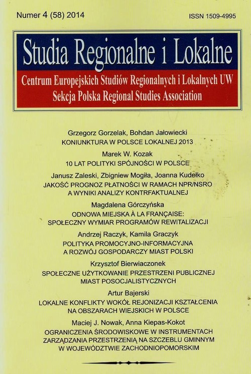 ARTYKUŁY [Articles] Grzegorz Gorzelak, Bohdan Jałowiecki: Koniunktura w Polsce lokalnej 2013 Marek W. Kozak: 10 lat polityki spójności w Polsce Janusz Zaleski, Zbigniew Mogiła, Joanna Kudełko: Jakość prognoz płatności w ramach NPR/NSRO a wyniki analizy kontrfaktualnej Magdalena Górczyńska: Odnowa miejska Andrzej Raczyk, Kamila Graczyk: Polityka promocyjno-informacyjna a rozwój gospodarczy miast Polski Krzysztof Bierwiaczonek: Społeczne użytkowanie przestrzeni publicznej miast posocjalistycznych. Przykład trzech miast górnośląskich Artur Bajerski: Lokalne konflikty wokół rejonizacji kształcenia na obszarach wiejskich w Polsce Maciej J. Nowak, Anna Kiepas-Kokot: Ograniczenia środowiskowe w instrumentach zarządzania przestrzenią na szczeblu gminnym w województwie zachodniopomorskim ze szczególnym uwzględnieniem gminnym w województwie zachodniopomorskim SPRAWOZDANIA „Ekonomiczne straty i społeczne koszty niekontrolowanej urbanizacji w Polsce”, Konferencja Kongresu Budownictwa i Fundacji Rozwoju Demokracji Lokalnej, Warszawa, 30 czerwca 2014 r., Sejm RP RECENZJE Wojciech Sońta: Joanna Bach-Głowińska, 2014, Inteligentna przestrzeń. Trzeci wymiar innowacyjności