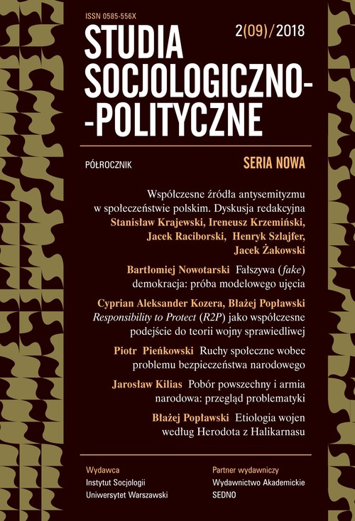 Bieżący numer „Studiów Socjologiczno-Politycznych. Seria nowa” 2(09)/2018 otwiera dyskusja redakcyjna na temat współczesnych źródeł antysemityzmu w społeczeństwie polskim. W dyskusji udział wzięli Stanisław Krajewski, Ireneusz Krzemiński, Henryk Szlajfer, Jacek Żakowski, a moderował ją Jacek Raciborski. Redaktorami numeru są dr hab. Jarosław Kilias oraz dr hab. Lech M. Nijakowski. Bartłomiej Nowotarski w artykule „Fałszywa (fake) demokracja: próba modelowego ujęcia” przedstawia teoretyczny model dla analizy współczesnego zjawiska odchodzenia od państwa liberalnego na rzecz nowej formy państwa autorytarnego. Tematem przewodnim numeru są zagadnienia wojny i sił zbrojnych. Autorzy zamieszczonych w nim studiów przedstawiają mozaikę tekstów poruszających problemy z pogranicza socjologicznych, historycznych i politologicznych aspektów wojny i wojska: (1) przebieg debaty nad zasadnością przeprowadzania interwencji humanitarnych w obliczu zagrożenia masowymi zbrodniami czy ludobójstwem (C.A. Kozera i B. Popławski), (2) historyczną analizę ruchów społecznych w kontekście bezpieczeństwa narodowego (P. Pieńkowski), (3) relacje między poborem powszechnym a narodzinami nowoczesnej armii narodowej (J. Kilias) oraz (4) etiologię wojen w ujęciu Herodota z Halikarnasu. Tom zawiera także recenzję książki Dariusza Libionki – popularnonaukowe przedstawienie badań dotyczących Zagłady Żydów na okupowanych ziemiach polskich (tereny Generalnej Guberni).