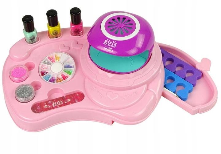 Studio paznokci zawiera: - 3 kolorowe lakiery i 2 brokaty - 2 separatory ułatwiające dekoracje paznokci - Pilnik - Mnóstwo ozdobnych naklejek w różnych kolorach i wzorach - Funkcjonalna suszarka z podświetleniem (2 x AA, zestaw nie zawiera) - Nauka zręczności, koordynacji i cierpliwości - Już od 6 roku życia