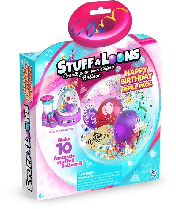Zestaw uzupełniający Stuff a Loons Happy Birthday pozwala na stworzenie 10 fantastycznych dekoracji. W opakowaniu znajduje się 10 przezroczystych balonów, 10 mini balonów, 3 wstążki, 5 klipsów wielokrotnego użytku, 2 opakowania konfetti oraz 2 opakowania brokatu, a także karteczka prezentowa. Produkt dedykowany jest do użytku ze stacją pompowania balonów Stuff a Loons.