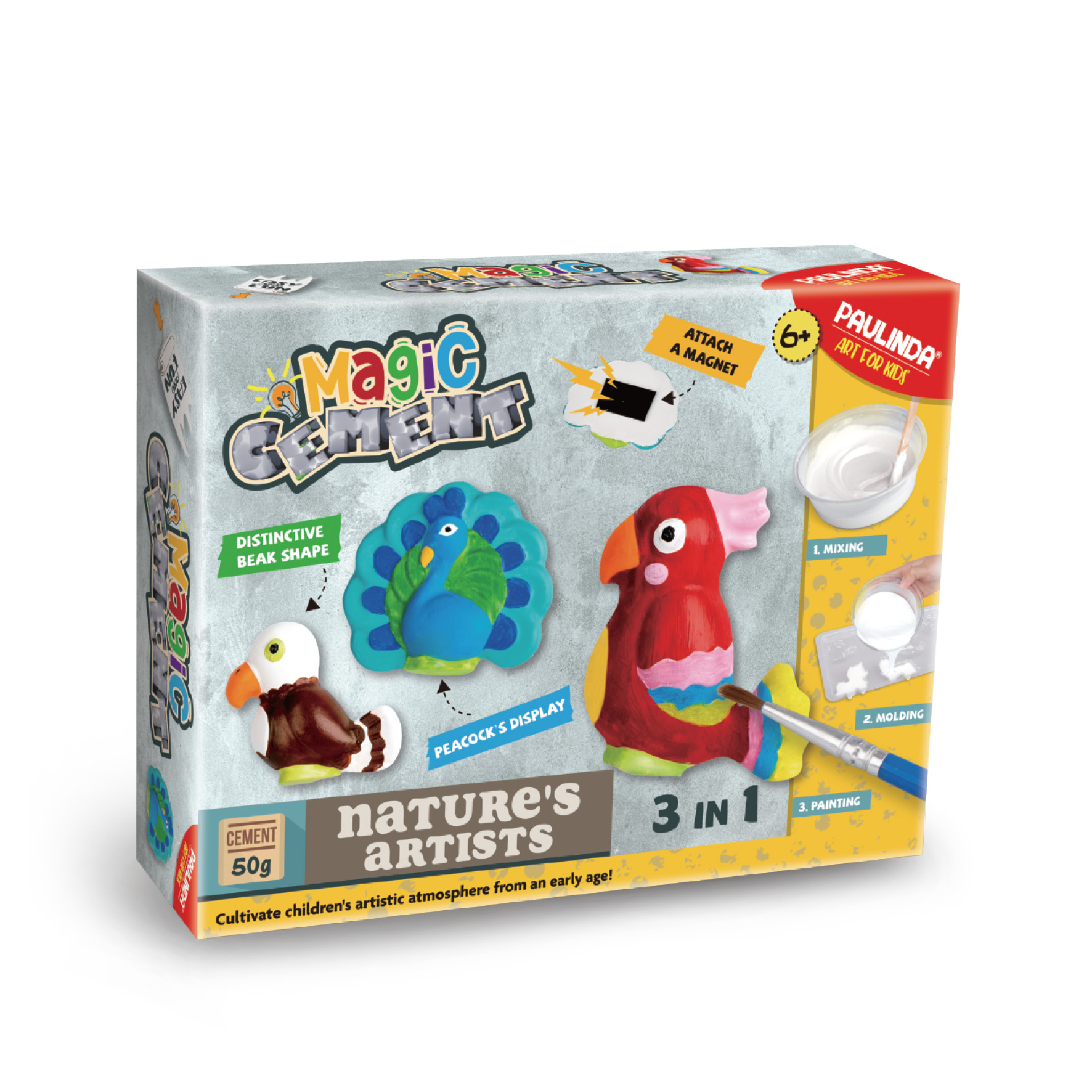 Kreatywny zestaw Strigo do samodzielnego stworzenia cementowej figurk. Idealny produkt do rozwijania zdolności manualnych i pobudzenia kreatywności. Rozwija również stymulacje sensoryczne, dzięki kolorom i różnym teksturom. Wystarczy wymieszać cement z wodą, wlać do foremki i zaczekać do całkowitego wyschnięcia. Zabawa polega na pomalowaniu w swój indywidualny sposób figurki, która może stać się ozdobą. Dzięki dołączonemu do zestawu magnesowi, figurkę można umieścić na powierzchniach magnetycznych. W zestawie: magiczny cement, plastikowe formy, magnesy, pigmenty, pędzelek, paletka, miseczka, mieszadło.