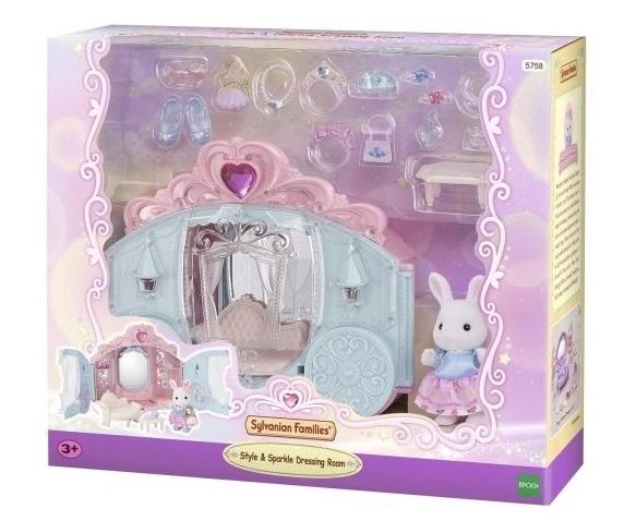 Zestaw do zabawy Stylowa Garderoba Sylvanian Families zawiera piękny, błyszczący powóz, akcesoria oraz figurkę dziewczynki z rodziny Śnieżnych Królików ubraną w strój księżniczki.