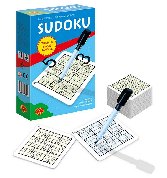 Sudoku to gra logiczna, która polega na uzupełnieniu pustych pól takimi cyframi, aby w każdej kolumnie, każdym wierszu i każdym kwadracie (3x3 kratki), wyróżnionym grubymi krawędziami, znalazły się wszystkie cyfry od 1 do 9. Sudoku, to doskonałe ćwiczenie spostrzegawczości, koncentracji i myślenia. Zestaw składa się z 35 dwustronnych plansz, na których znajduje się 70 tablic Sudoku do rozwiązania. Plansze, na których wpisuje się cyfry pokryte są folią, a do pisania służy znajdujący się w pudełku zmazywalny pisak. Dzięki temu każdy błąd można łatwo zmazać i poprawić, a wszystkie tablice można używać wielokrotnie. Zawartość pudełka: 35 dwustronnych plansz, pisak, instrukcja.