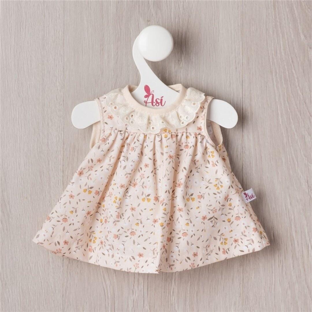 Stylową bawełnianą sukienkę w delikatnej kolorystyce wykończono białym gipiurowym kołnierzykiem. Ręcznie szyty w Hiszpanii strój został zaprojektowany specjalnie dla małpki hiszpańskiej o imieniu Lola z unikalnej kolekcji ASI Animal Reborn. Umieszczony na tekturowym wieszaczku z logo marki ASI i zapakowany w foliowe opakowanie uatrakcyjnia zabawę pachnącymi wanilią małpkami.