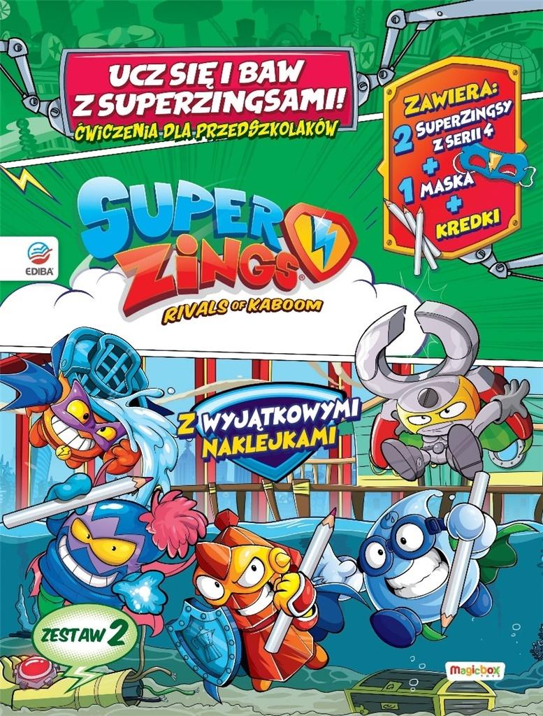 Kolorowa książeczka edukacyjna dla przedszkolaków z zadaniami, łamigłówkami i ćwiczeniami łączącymi zabawę z nauką. W kartonowej teczce SuperZings znajdują się: 60 stronicowa książka oraz dodatki: dwie saszetki SuperZings z serii 4, kredki SuperZings i maska (niebieska lub czerwona - wysyłana losowo).
