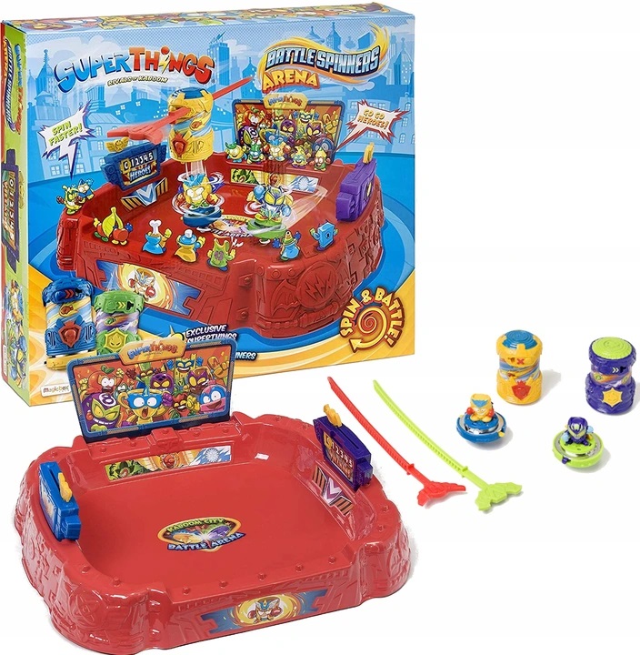 SuperThings dopingują uczestników epickiej batalii na Battle Arena w Kaboom City. Tłoczą się wokół areny przygotowani do walki. 3, 2, 1… Battle Spinners ruszają na pełnych obrotach, wirują, zbliżają się do siebie, zderzają, uciekają! Kto zostanie zwycięzcą? Nie przegap wyników, bo wszystko rozstrzyga się na SuperThings Battle Arena!