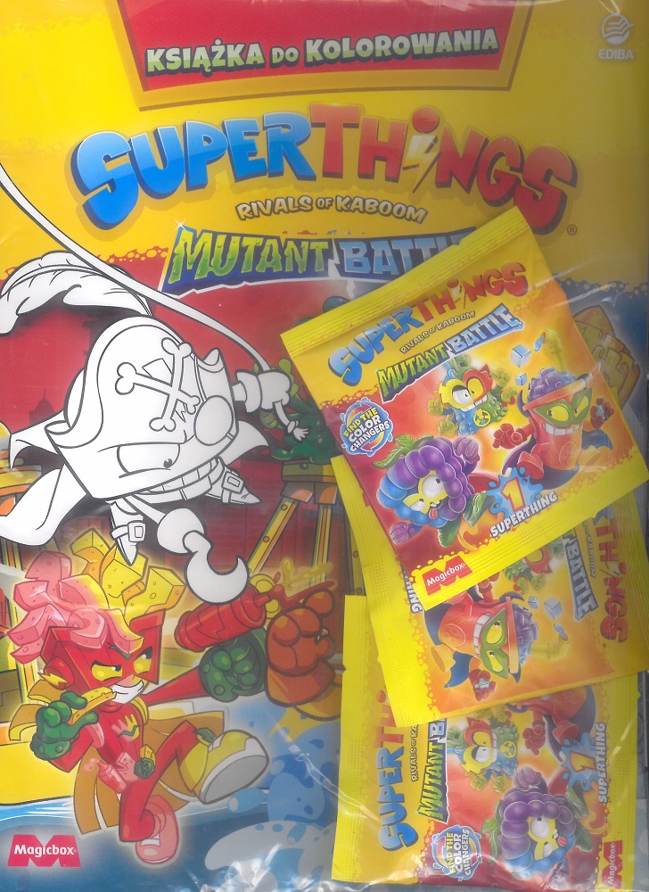 Poznaj nową serię SuperThings Mutant Battle! Fala dziwacznych mutujących mocy ogarnęła ulice Miasta i wzmocniła niektórych SuperThingsów. Szczególną postacią jest Morph, nie do końca udane dzieło Profesora K. Mister King uciekł z więzienia i jedyne, o czym teraz myśli, to przejęcie pełnej kontroli nad Kaboom City. Wszystko wskazuje na to, że ostateczna bitwa jest nieuchronna. Dzięki wyjątkowej książce do kolorowania SuperThings dowiesz się jakie sekrety i nowe moce skrywają bohaterowie kolekcji Mutant Battle. Czeka na Ciebie 36 stron pełnych zadań logicznych, kolorowanek oraz opisów nowych postaci z Kaboom City. Dołącz do przygód swoich ulubionych postaci w tej niesamowitej książce do kolorowania! Do książki dołączone są trzy saszetki SuperThings z najnowszej serii Mutant Battle.