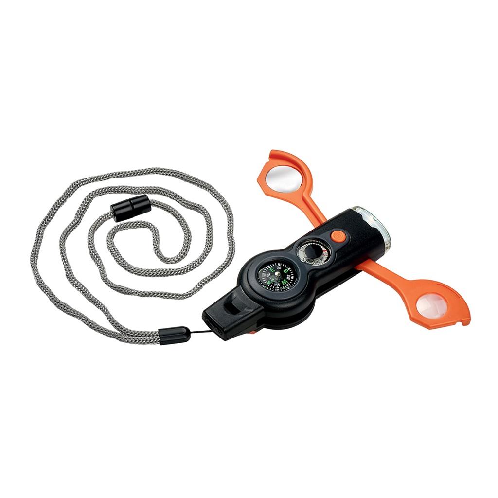 Praktyczny zestaw przetrwania dzięki któremu masz pod ręką wszystko  czego potrzebujesz. Narzędzie zawiera łącznie sześć funkcji, które  przydają się podczas wędrówek, wakacji na kempingu lub przygód na  świeżym powietrzu. Znajdziemy w nim mocną latarkę LED, gwizdek alarmowy, kompas, termometr, lupę z 2-krotnym powiększeniem, lusterko plus  odpinany pasek. Mieści się w każdym plecaku, a nawet w każdej kieszeni  kurtki, dzięki czemu jest zawsze pod ręką. Dzięki odpinanemu paskowi  narzędzie survivalowe można wygodnie nosić również na szyi.