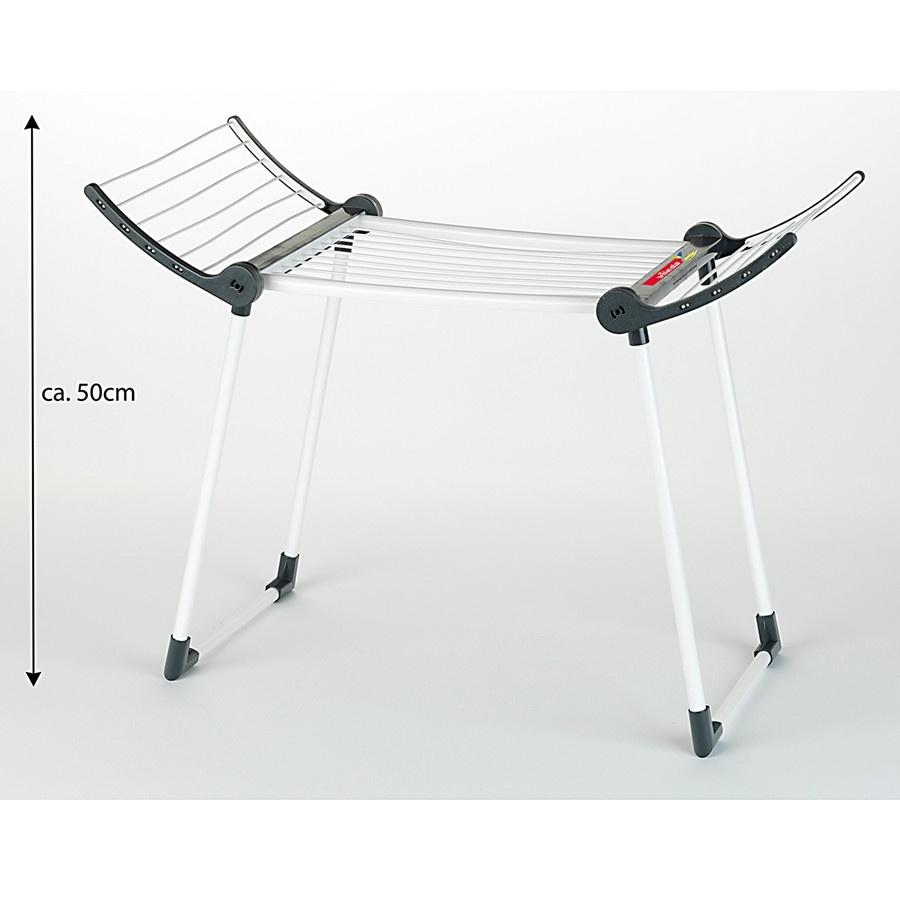 Suszarka do ubrań powstała na licencji firmy Vileda, dlatego też jest wierną kopią prawdziwej suszarki tej marki. Zabawka jest w kolorze białym z granatowymi elementami i można ją także jak prawdziwą suszarkę złożyć do mniejszych rozmiarów, dzięki czemu nie zajmuje dużo miejsca, kiedy dziecko się nie bawi. Zabawka składa się z podwójnych nóg zapewniających jej stabilność oraz właściwej suszarki wyposażonej w dwa składane skrzydła. Wysokość rozłożonej suszarki to ok 50 cm, a łączna szerokość z rozłożonymi bocznymi skrzydłami wynosi około 65 cm. Niska waga i rozmiary zabawki sprawiają, że suszarka ta doskonale spełni swoją rolę do wieszania ubranek lalek, wypranych maskotek, czy nawet suszenia świeżo wypranych ubranek dziecka. Dzięki tej suszarce dzieci nauczą się więcej o codziennych czynnościach w bezpieczny sposób. Zabawka ta została stworzona solidnie i z dbałością o wszystkie szczegóły oryginału.