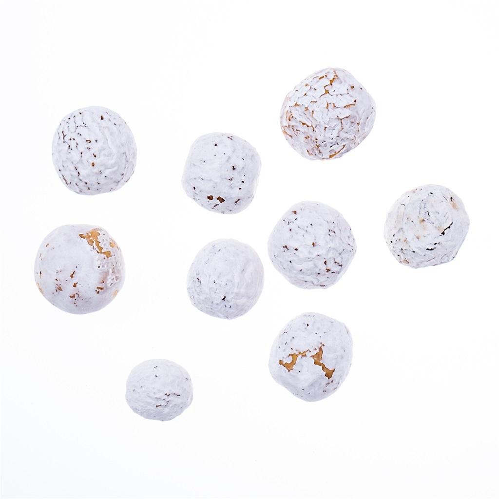 Naturalne owoce melii pokryte warstwą białej farby, która wydobywa nieregularną fakturę ich powierzchni.