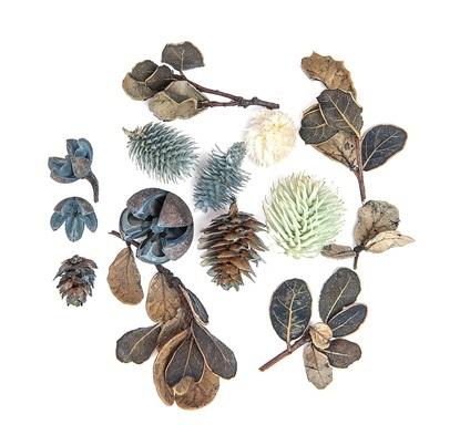 W zestawie znajdziesz m. in. egzotyczne owoce, szyszki, liście, i elementy takich roślin, jak platykaria szyszkowata oraz szczeć.