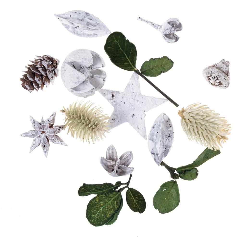 Kompozycja suszonych liści i bielonych owoców egzotycznych. W zestawie znajdują się naturalne liście, szyszki, gwiazdka z kory i egzotyczne owoce pokryte białą farbą.