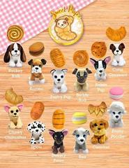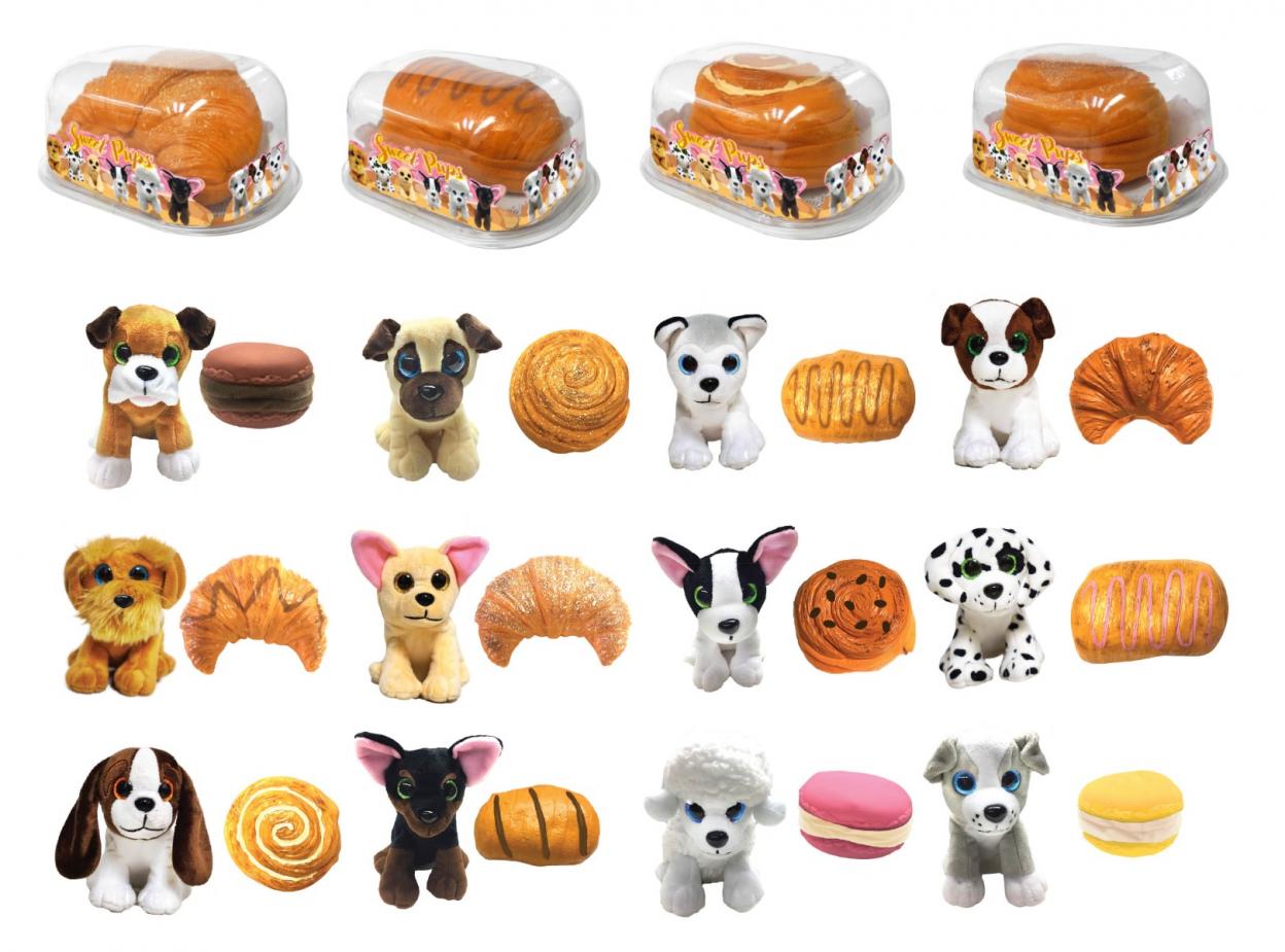 Pluszowe pieski zapakowane w miękkie futerały w kształcie bułeczek. 12 sztuk w displayu. Dla dzieci w wieku od 3 lat