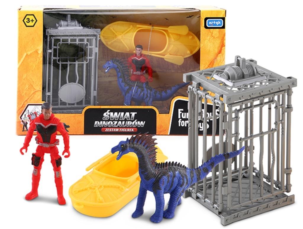 W ZESTAWIE: FIGURKA KAJAKARZA 9 CM., KAJAK Z WIOSŁAMI, KLATKA, DINOZAUR, AKCESORIA, WYM. OPK: 26 X 17,5 X 10 CM., 3+