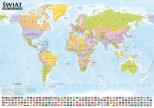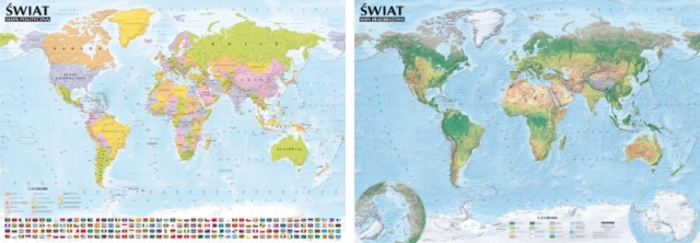 Świat. Mapa polityczna i krajobrazowa dwustronna mapa ścienna 1:21 500 000 format: 138x97cm oprawa: forma plakatu pakowana w plastikową tubę Solidna, dwustronnie laminowana mapa ścienna. Po jednej stronie znajduje się mapa polityczna świata, na odwrocie – mapa krajobrazowa. Mapa w polskiej wersji językowej opracowana zgodnie z zaleceniami Komisji Standaryzacji Nazw Geograficznych poza Granicami Rzeczypospolitej Polskiej. Strona pierwsza - mapa polityczna: - wszystkie państwa świata oraz terytoria zależne - stolice państw i terytoriów zależnych - najważniejsze miasta - flagi wszystkich państw wraz z informacją o położeniu państwa na mapie - delikatna, plastyczna rzeźba terenu oraz dna morskiego Strona druga - mapa krajobrazowa: - od lasów tropikalnych przez stepy i pustynie po tundrę i obszary wiecznie pokryte lodem - krajobrazy Ziemi w połączeniu z plastyczną rzeźbą terenu oraz dna morskiego tworzą niezwykle obrazową prezentację naszej planety - opisy pasm górskich, nizin, wyżyn i innych regionów fizyczno-geograficznych - najważniejsze szczyty, przełęcze i przylądki - opisy oceanów, mórz, jezior, rzek i innych elementów hydrograficznych - dodatkowe mapy pokazujące obszary podbiegunowe