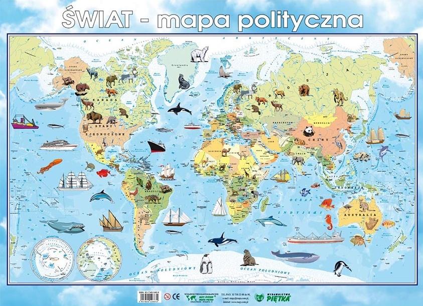 Wspaniała propozycja edukacyjna to podkładka nabiurkowa polityczna świata z rysunkami zwierząt uwzględnia aktualny podział polityczny świata, ale dodatkowo zawiera wizerunki typowych dla danego rejonu zwierząt. W inny i bardzo atrakcyjny sposób uczy poprzez zabawę wykorzystując różnorodne elementy. Wyprodukowana z najwyższej jakości materiałów gwarantuje wytrzymałość przy ewentualnych zanieczyszczeniach czy zniszczeniach.