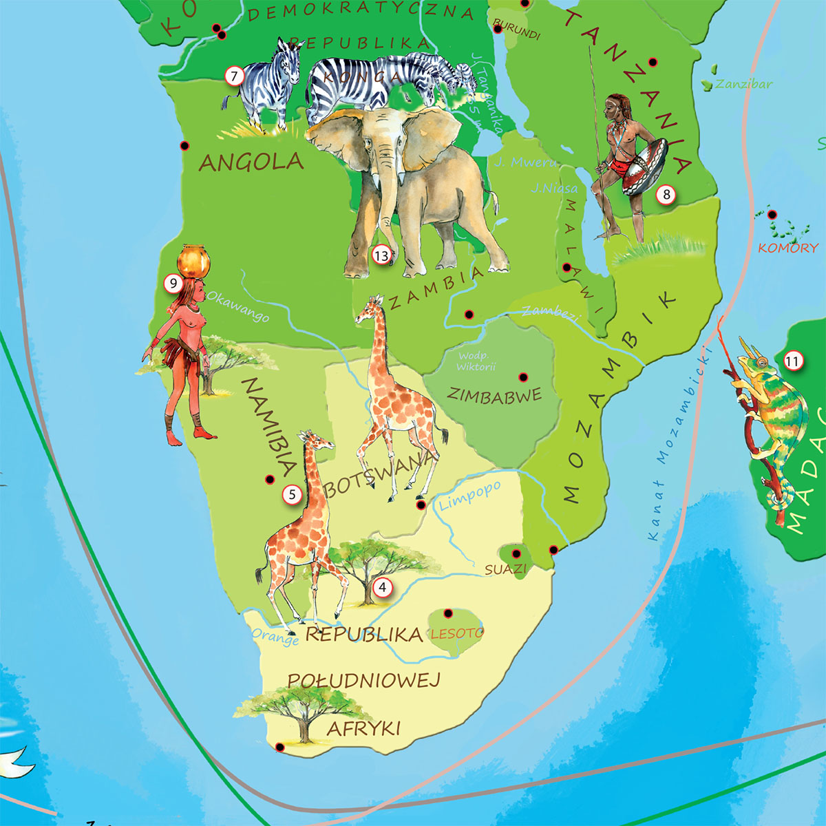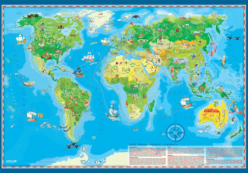 Geograficzna podkładka z mapą świata dla dzieci, pełniąca rolę edukacyjną oraz dekoracyjną. Zaznaczono na niej barwnie kontynenty wraz z ukształtowaniem terenu, jak też za pomocą kolorowych piktogramów najbardziej znane budowle świata, zwierzęta, pomniki przyrody, wydarzenia. Dzięki temu mapa jest fascynującym źródłem wiedzy o historii i teraźniejszości naszej planety. Przekazuje w ciekawy sposób informacje z zakresu geografii, przyrody i kultury. Pobudza wyobraźnię, zachęca do zdobywania wiedzy i inspiruje. Jest również świetnym pretekstem do spędzania w twórczy sposób wspólnego czasu rodziców z dziećmi. Jakość i estetyka wykonania sprawiają, że stanowi ozdobę dziecinnego pokoju.