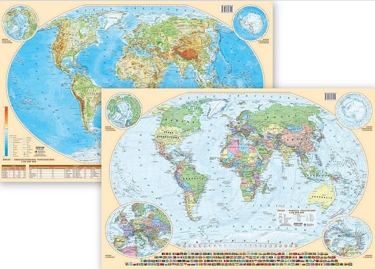 Znakomicie przygotowana, dwustronna podkładka na biurko z mapą świata w skali 1:60 000 000, polityczną (awers) oraz fizyczną (rewers). Prezentuje najważniejsze, aktualne informacje o kontynentach świata. Ciekawie zaprojektowana, oprócz map, mieści również dodatkowe elementy, pomocne w poznawaniu świata.
