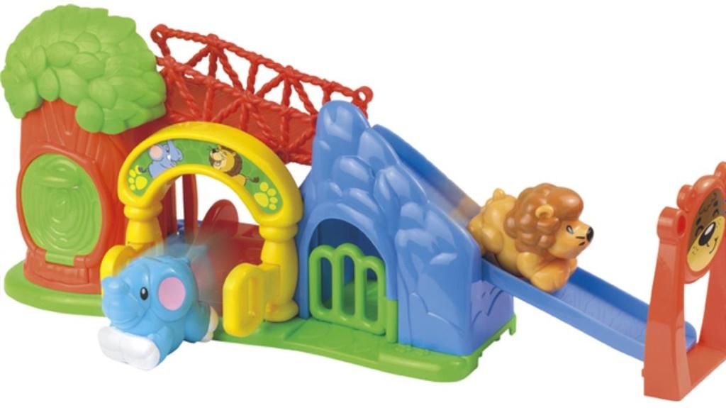 Zamień pokój swojego Maluszka w Ogród Zoologiczny! Zabawka kryje w sobie mnóstwo niespodzianek, stworzonych z myślą o małych zwierzątkach dołączonych do zestawu: słoniku i lwie. Odkryj razem z nimi kryjówki w jaskini i drzewku, ręczną windę, karuzelę i rozkładaną zjeżdżalnię! Zwierzątka potrafią jeździć, wystarczy pchnąć je paluszkiem, aby ruszyły do przodu. Dołączoną do zabawki dostawkę z podobizną uśmiechniętego misia można przymocować do zjeżdżalni. Zabawka przeznaczona dla dzieci powyżej 18 miesiąca życia