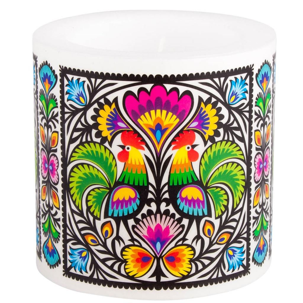 Dekoracyjna świeca lampion FOLK z ludowym wzorem kogutów z łowickiej wycinanki : projekt inspirowany tradycyjnymi wzorami ludowymi z wycinanek łowickich,podstawowymi elementami wycinanek łowickich są koguty, pawie oraz motywy kwiatowe,po zapaleniu lampionu światło płomienia pięknie oświetla zewnętrzny wzór,estetyczne opakowanie z celofanu i szarego sznurka
